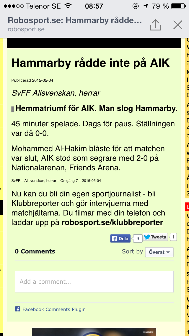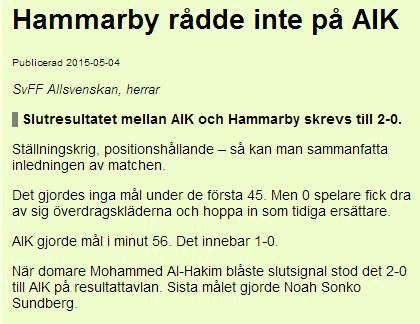 Det har varit en vecka full av robotjournalistik. Medierna i P1 tog upp det faktum att Mittmedia kommer att börja med robotjournalistik inom kort och berättade också om robotsajten Robosport som bloggen Robotnyheter beskriver här. Jag lyssnade på Medierna på väg till jobbet i tisdags morse. Kvällen innan hade jag varit på Friends Arena och sett derbyt mellan AIK och Hammarby. Jag var nyfiken på Robosport och kollade vad robotarna hade fått ihop om matchen. Jag hittade det här:
