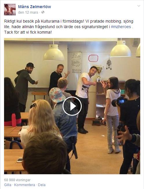 Där uppmanar Måns sina unga fans att göra en 15 sekunder lång film och lägga upp den på Instagram. Vinnande klass skulle få ett irl-besök av självaste Måns. Men det som verkligen fick barnen att lägga upp bidrag var uppmaningen att prata om mobbing i klassen och även att filmen skulle handla om hur klassen är hjältar och stoppar mobbing när den uppstår. Detta är inte bara smart pr, detta är en fråga som Måns Zelmerlöw själv känner stark för efter egna erfarenheter. Det var här han vann över de unga i min närhet.
