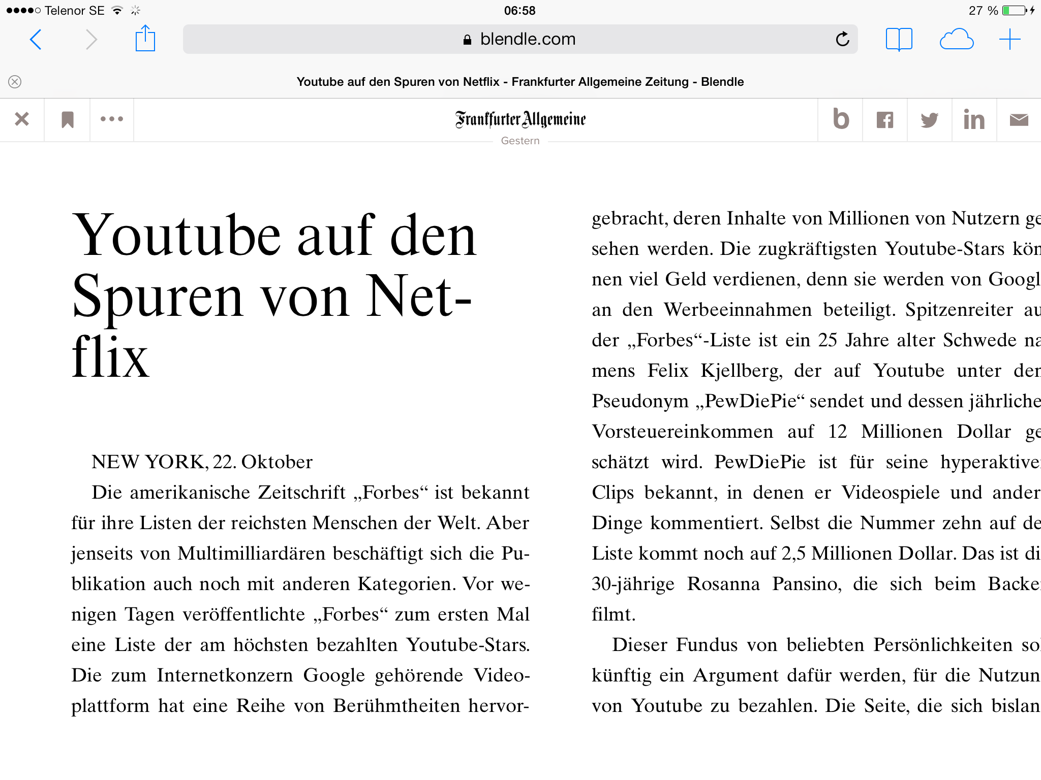 Artikeln kan jag, om jag vill, spara till min Pocket och givetvis lätt dela med mina vänner via exempelvis Facebook och Twitter. Jag har också valet att få tillbaka mina 0,45 euro om artikeln inte motsvarar förväntningarna. Kundfokuserat!